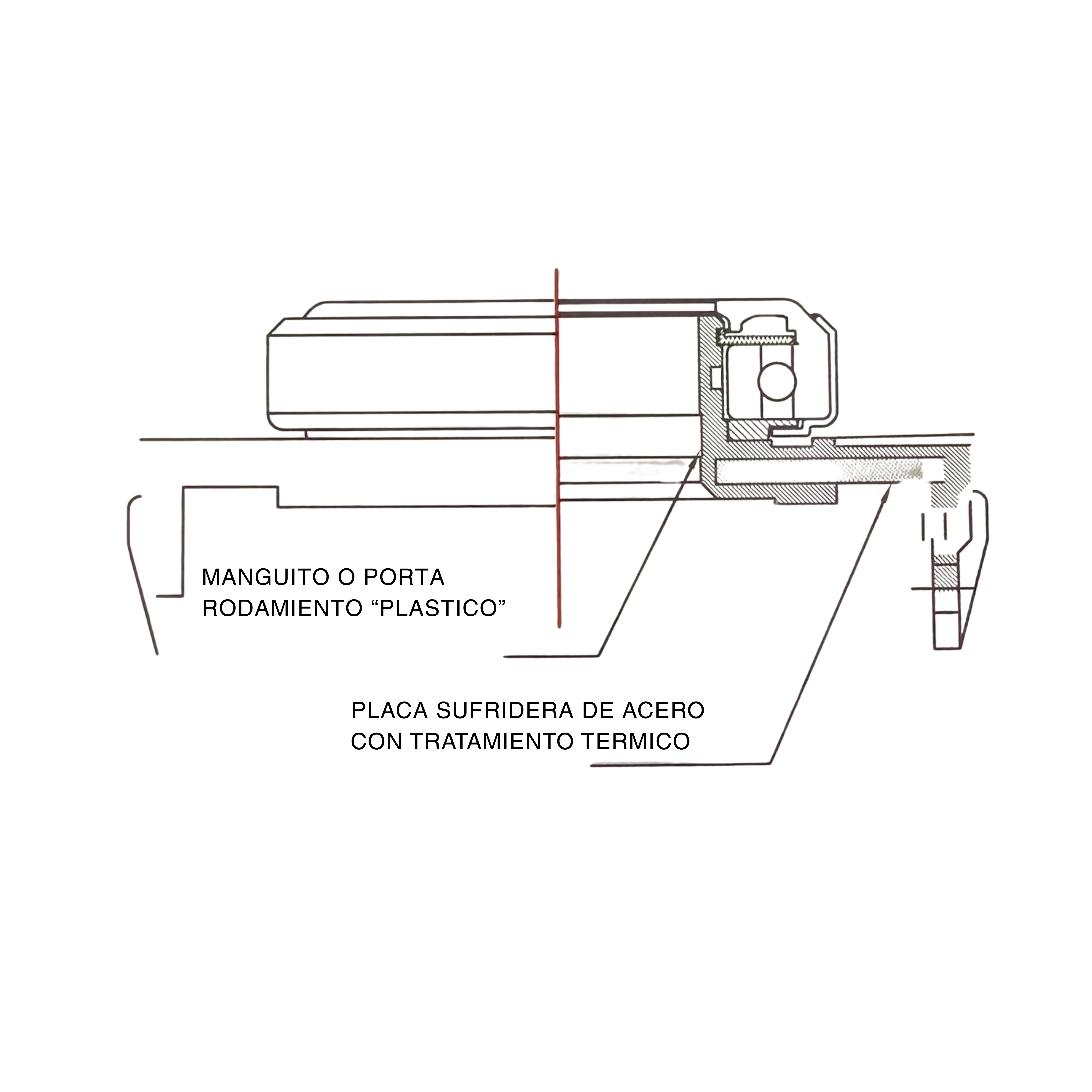 3. Plásticos: material acorde a su importancia, llamado P. A. 6.6 + 33% FV estabilizado al calor; estos manguitos llevan insertos o placas de acero con su correspondiente tratamiento térmico (llamadas sufrideras) donde apoyan las horquillas.